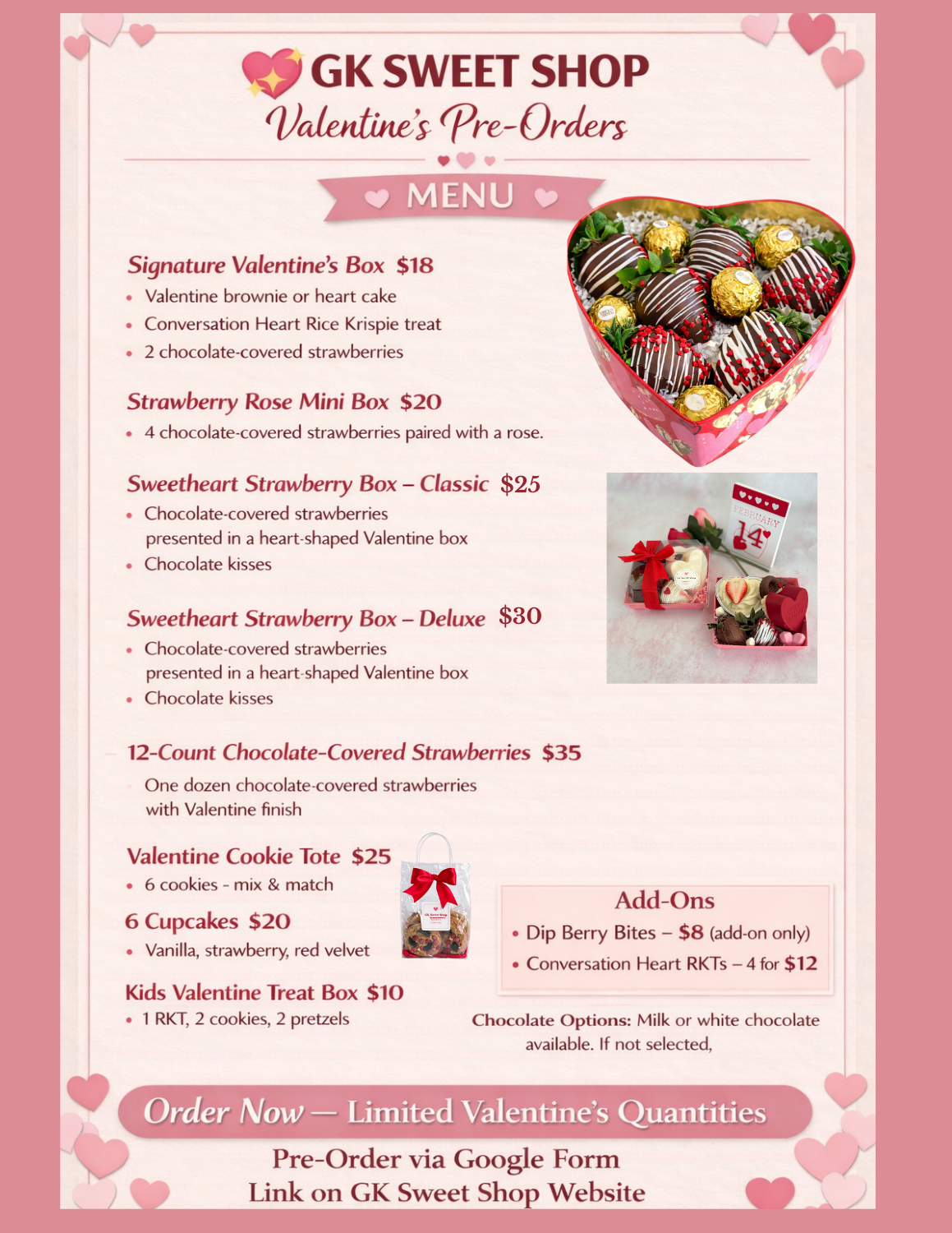 Valentine’s Day treats are available by pre-order only.Pickup and local delivery options available.Limited quantities.